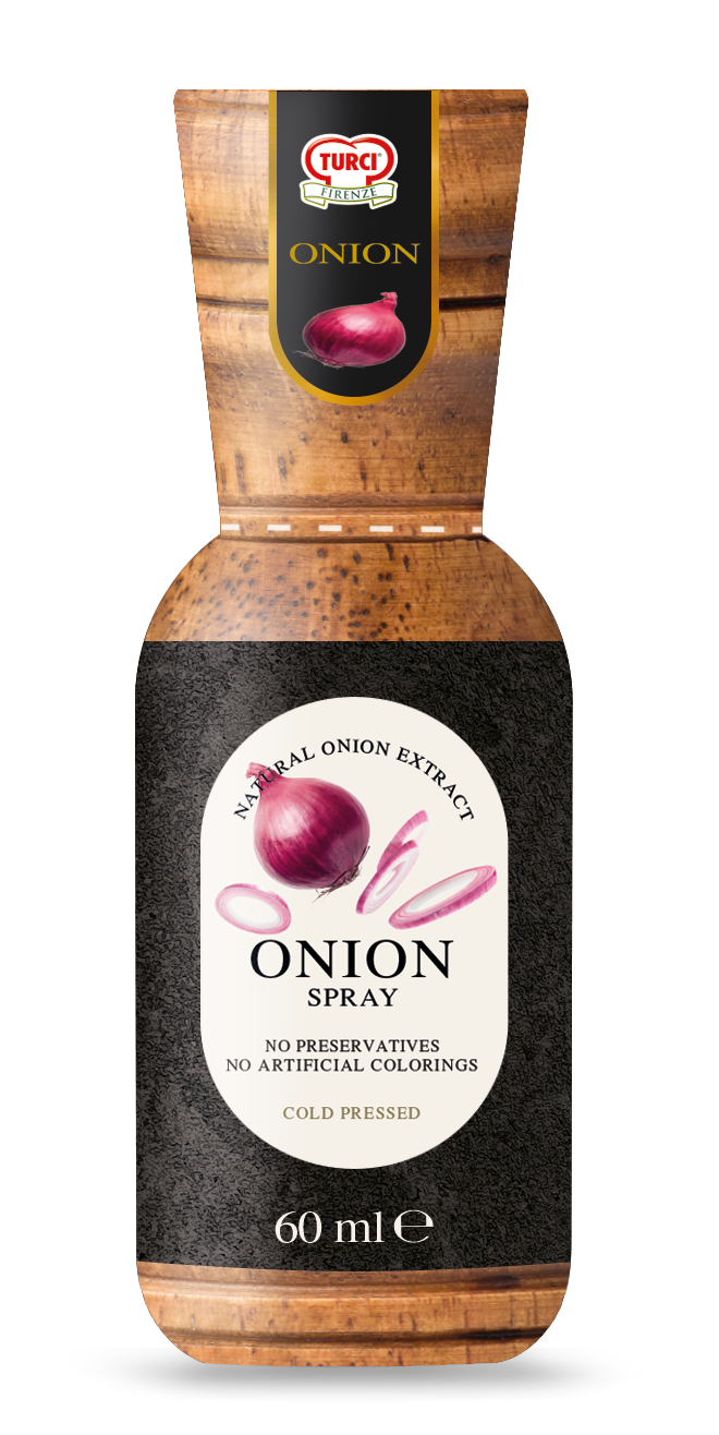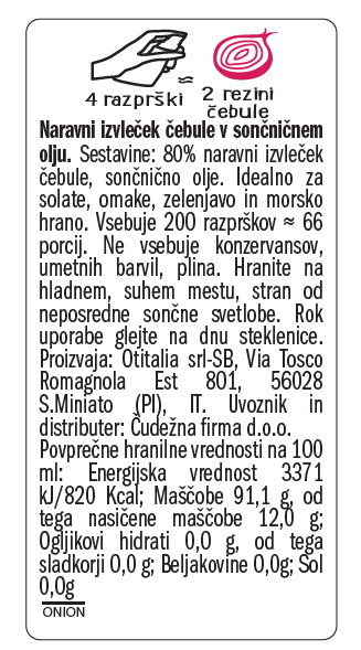 Naravni izvlecek cebule v soncnicnemolju. Sestavine: 80% naravni izvlecekcebule, soncnicno olje. Idealno zasolate, omake, zelenjavo in morskohrano. Vsebuje 200 razprškov 66porcij. Ne vsebuje konzervansov,umetnih barvil, plina.